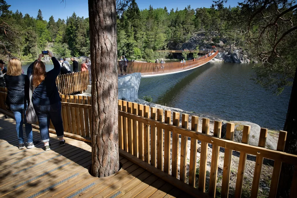 Hängbron som binder ihop Alby och Tyresta invigdes i somras – två år försenad.