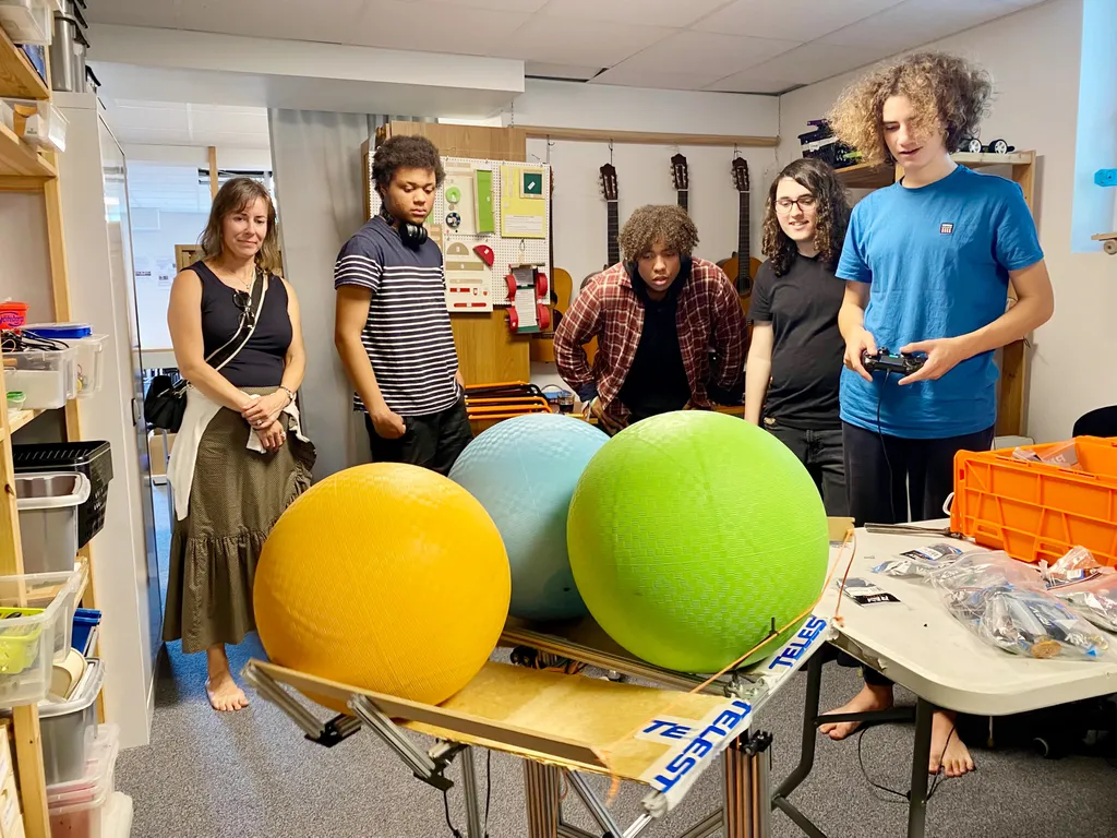 I Kosmosklubbens källarlokal intill Sockenplan visar laget den robot som de tävlade med i fjol. En kanon kastar ifrån sig olika stora bollar, och vid tävlingstillfället skulle den pricka olika containrar.