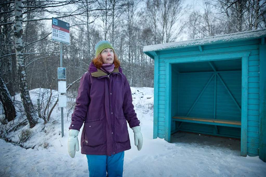 Pernilla Hugoson bor nära hållplatsen Karlskär. I 15 år har hon åkt buss härifrån till jobbet på Sös, men sedan SL förändrade tidtabellerna går det inte längre.