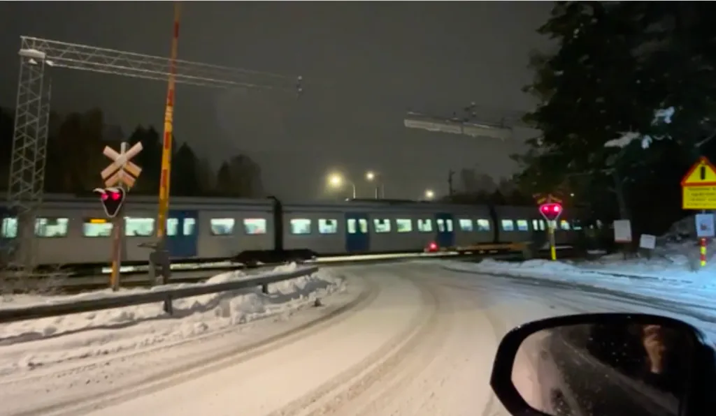 På en filmsnutt som Mitt i tagit del av syns ett pendeltåg komma på spåren vid Fagersjövägen. Tåget kryper fram och föraren tutar flera gånger innan loket korsar bilvägen. Orsaken: Bommarna är inte nere.