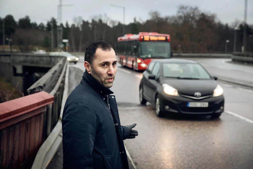 Det var på lördagskvällen den 27 januari som Reza körde ner i ett potthål på bron som leder Bromstensvägen över till länsväg 279 och Rissneleden. Han blev stående i mörkret med sin punktering.
