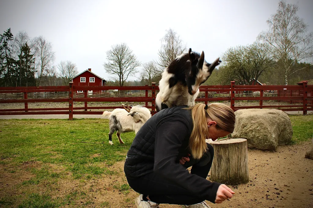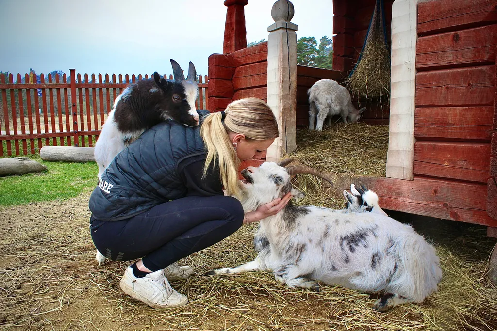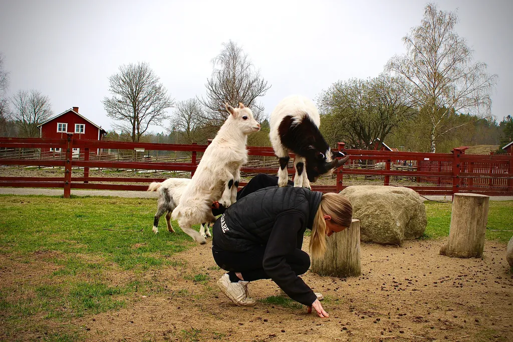 Mitt bland djur och barnfamiljer rör sig Nova Sjöberg med ett naturligt lugn. Hon är djurskötare på Uddby gård sedan tre år tillbaka och har blivit en självklar del av gårdens hjärta. Lammen följer henne nyfiket och killingarna klättrar vilt på henne när hon kommer in i hagarna.