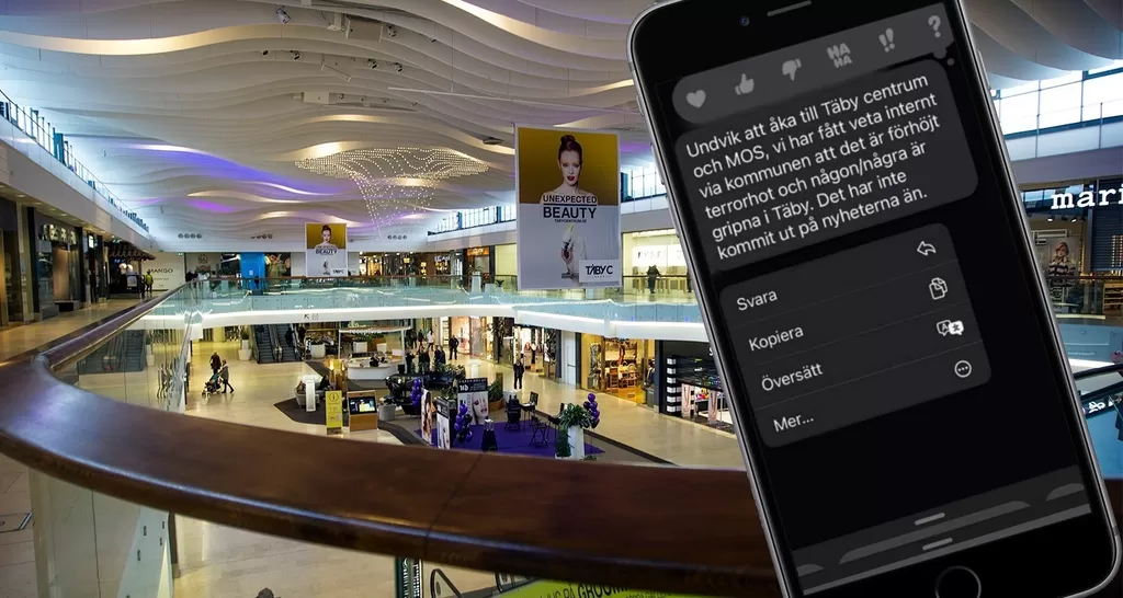 Under dagen har flera personer fått ett sms där de uppmanas att hålla sig bort från Täby centrum och Mall of Scandinavia eftersom det enligt sms:et skulle planerats dåd där samt att terrorhotet skulle vara högt. I meddelandena står det att informationen kommer från Täby kommun men även från SOS alarm.