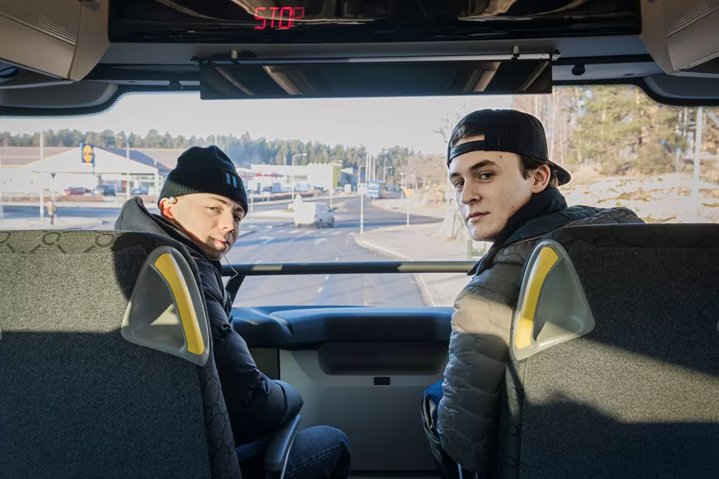 Eddie Plomin och Zeb Lager har tagit plats på övervåningen, längst fram. De klev på i Hemmesta vägskäl och ska till Nacka trafikplats.