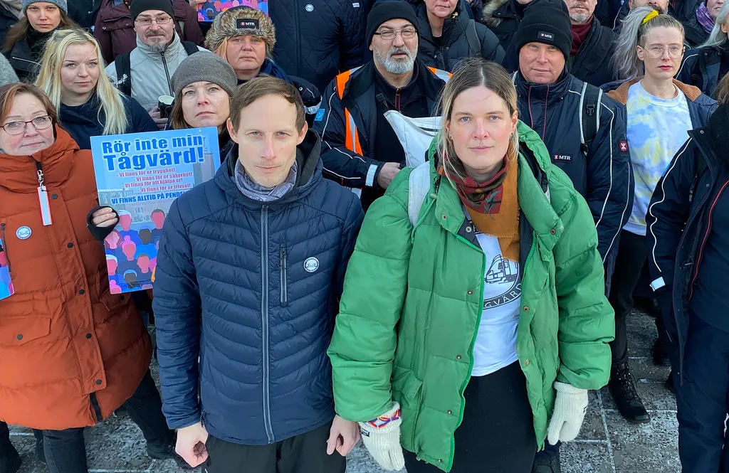 Nils Westberg Ahlmark (till vänster) och Moa Friman är två av lokförarna som har lett motståndet mot avvecklingen av tågvärdarna. Här vid en manifestation förra året.