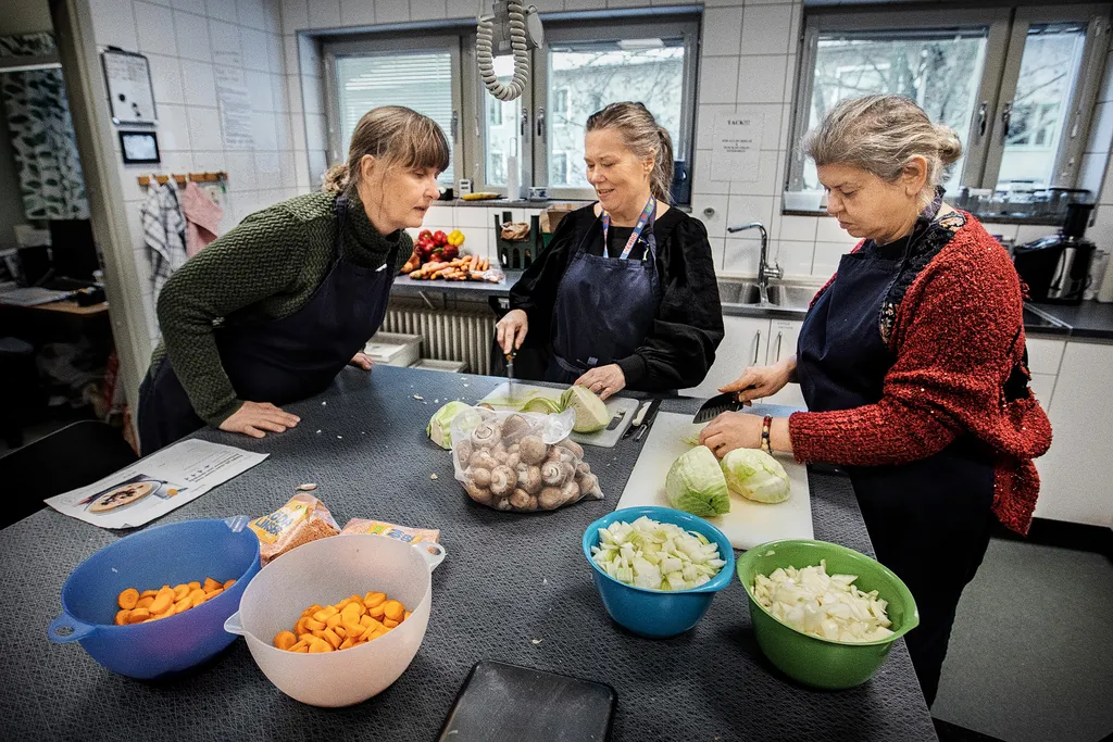 Sedan dess samlas ett gäng volontärer runt köksön i Kummelby kyrka varje onsdag för att hacka, skära och tillaga grönsakerna.
