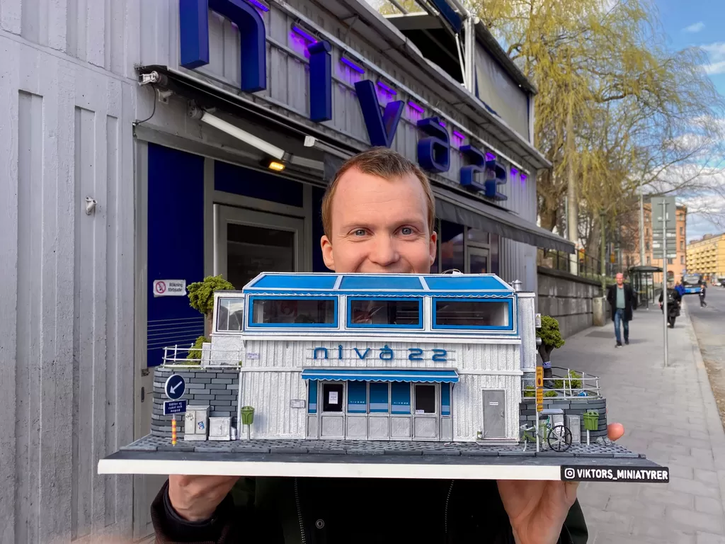 Han har lagt över hundra timmar på att bygga modellen av kulthaket där många 18-åriga stockholmare har druckit sina första stora stark.